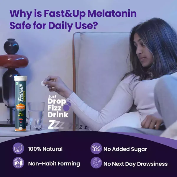 Fast&Up Melatonin is a natural, non-addictive sleep aid designed to help you fall asleep faster and improve sleep quality. Each effervescent tablet combines 5mg of Melatonin with 100mg of L-Theanine, promoting relaxation and restful sleep without next-day drowsiness.
