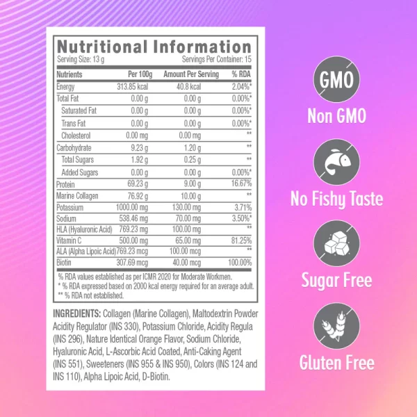 • 10g Marine Collagen per serving for enhanced skin elasticity and reduced wrinkles.