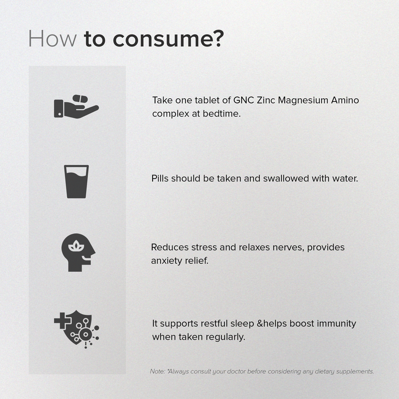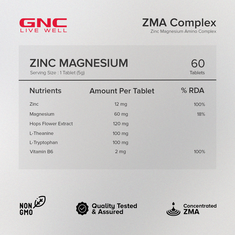 GNC Pro Performance Zinc Magnesium Amino (ZMA) Complex is a dietary supplement designed to support restful sleep, reduce stress and fatigue, and boost immunity. Each tablet combines zinc, magnesium, vitamin B6, amino acids, and hops flower extract to promote overall well-being.