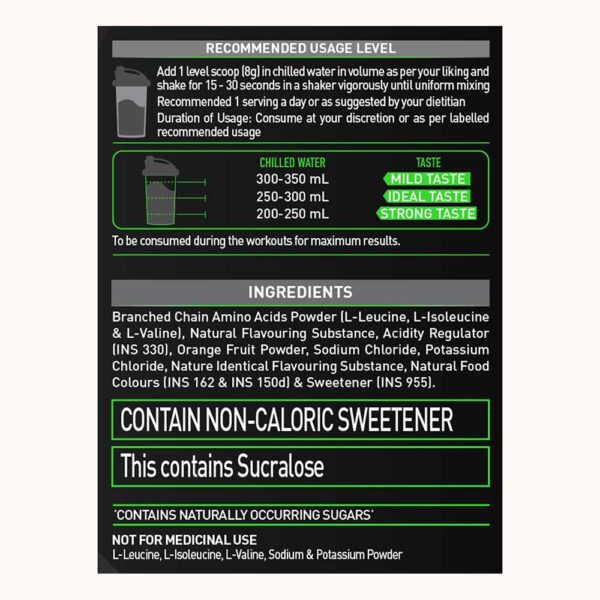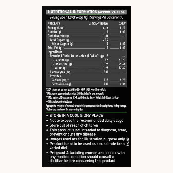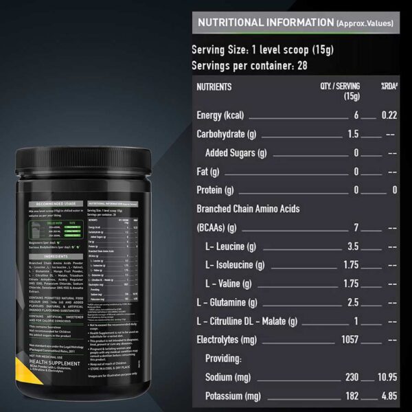 - 7g BCAAs per 15g serving in a 2:1:1 ratio (Leucine:Isoleucine:Valine) to support muscle protein synthesis and reduce catabolism.