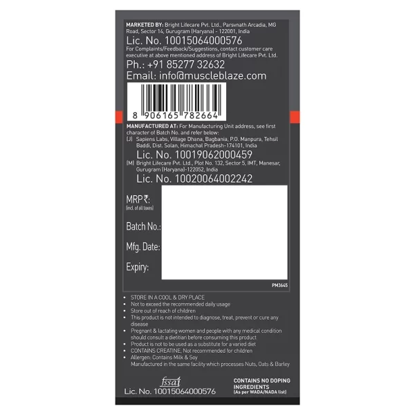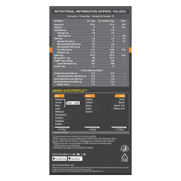MuscleBlaze Biozyme Whey PR is a premium protein supplement designed to enhance muscle strength, endurance, and lean muscle mass. Each serving delivers: