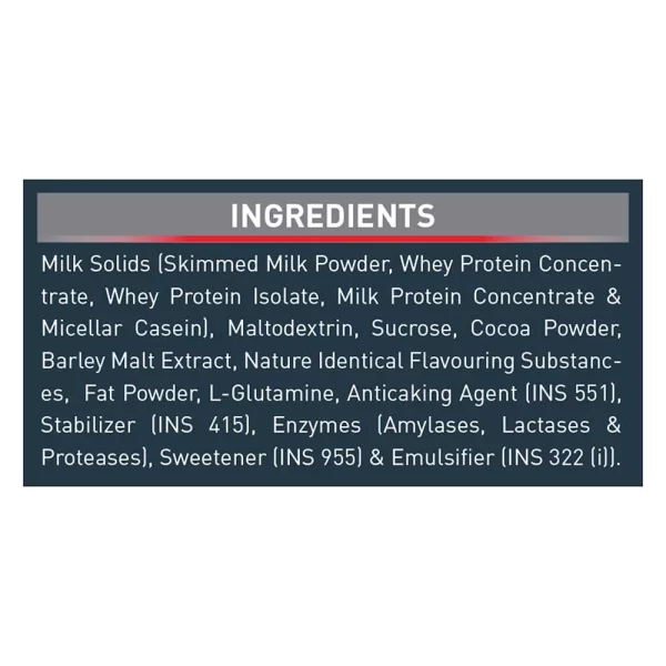 - Others: Cocoa Powder, L-Glutamine, Fat Powder, Vitamins (A, B-complex, C, D, E, K), Minerals (Calcium, Iron, Zinc, etc.), Digestive Enzymes (Amylase, Lactase, Protease), Sweeteners (INS 955), Stabilizers (INS 415)
