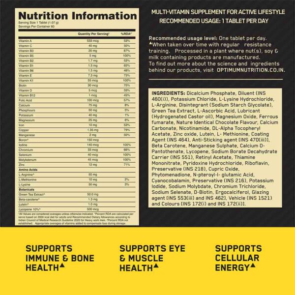 Optimum Nutrition (ON) Multivitamin for Men is a dietary supplement designed to support men’s overall health and well-being. Each bottle contains 60 unflavored tablets, formulated to fill nutritional gaps and boost the immune system. :contentReference[oaicite:0]{index=0}